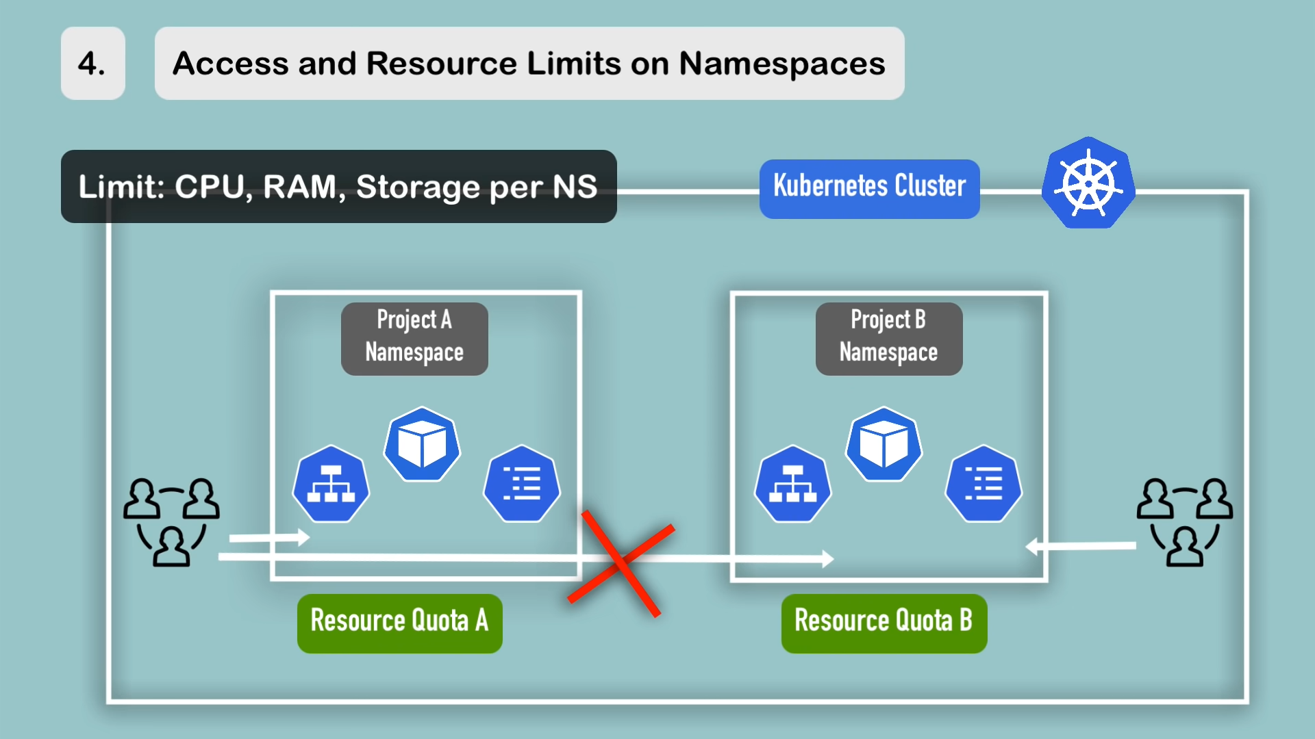 A와 B팀이 각자의 네임스페이스를 가지고 있고, 각자의 네임스페이스 내부에서 컴포넌트의 create, delete 등의 활동을 하는 중이다. 하지만 A와 B 팀은 서로의 네임스페이스가 가진 자원을 사용할 수 없다. 절대적으로 자원의 사용을 제한하면서 독립적인 공간을 만들기 위함이다. 하지만 A팀이 자원을 너무 많이 사용해 버린다면 시스템의 자원은 한정되어있기 때문에 B팀은 자신들이 사용할 자원이 부족해지게 된다. 이와 같은 불공평한 상황을 해결하기 위해서 각각의 네임스페이스에 RAM, CPU 같은 자원을 임의로 할당해 줄 수 있다.