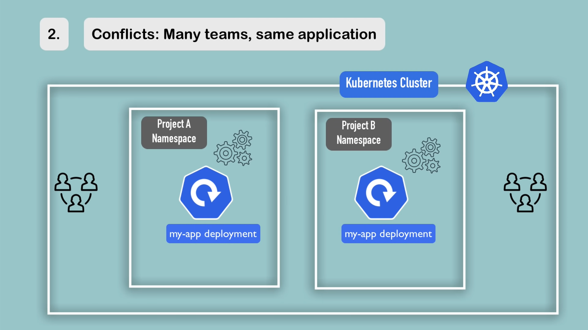 A팀이 my-app 이라는 Deployment를 배포중이었다. 그런데 B팀도 my-app이라는 Deployment를 같은 네임스페이스에 배포해버리면, B팀의 my-app Deployment는 A팀의 my-app을 덮어씌어버리게 된다. 특히 jenkins 같은 빌드, 배포 자동화 도구를 사용한다면, B팀의 my-app이 A팀의 my-app을 덮어쓰기 하는지도 모른 채로 배포가 될 것이다.